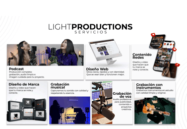 Ofrecemos ingeniería en audio, producción digital, podcast, desarrollo web y gestión de redes sociales.